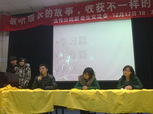 12月17日晚六点半,法律与传媒分院生活实践部在NF103召开了一场题为“聆听成长的故事,收获不一样的人生”的新老生交流会。交流活动中,互动形式多样,小礼品派送不断,气氛异常热烈。