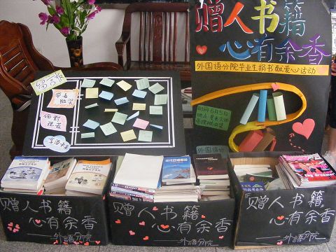 为了使2009年外国语分院毕业生能够顺利离校,减轻它们搬运的负担,同时在临行前送出对学弟学妹的期许、留下对母校的感恩与祝愿,此次活动志愿者不辞辛劳地将捐赠书籍从楼上搬下来。大四的毕业生也纷纷在标有“带着微笑”、“面对现在”、“享受未来”的留言板上,写下了自己对学校、对老师、对朋友及对学弟学妹们真切的寄语。