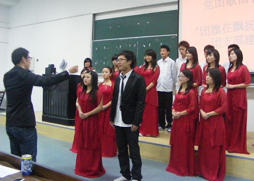 比赛在06英语4班雄壮有力的《走进新时代》合唱声中拉开序幕。全体参赛人员服装统一,意气风发,高亢激昂的歌声响彻整个教室。随后的07英语6班,胸前别着团徽,手腕上系着红丝带,带来了《太阳最红,毛主席最亲》那宏亮悦耳的歌声。07中美班则以一袭鲜艳的红色盛装给观众留下了深刻的印象,他们唱出了自己热爱党、热爱社会主义祖国的心声。