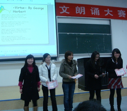 各位选手以饱满的热情、精彩的表演,博得了现场观众的阵阵掌声。其中李增和郑一闻同学标准的发音,娴熟的技巧,声情并茂的朗诵给评委留下了深刻的印象。每个选手在与评委的问答环节中也都显示出了不凡的智慧,对答如流,显示了外语学子扎实的专业基础。